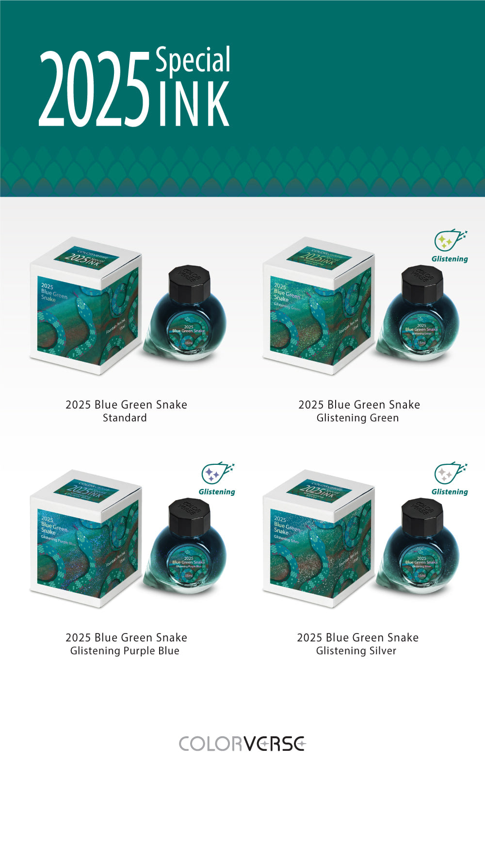 This 15ml glass bottle of Colorverse Blue Green Snake fountain pen ink is a teal green color with silver shimmer and red sheen. This is a special edition color for 2025.