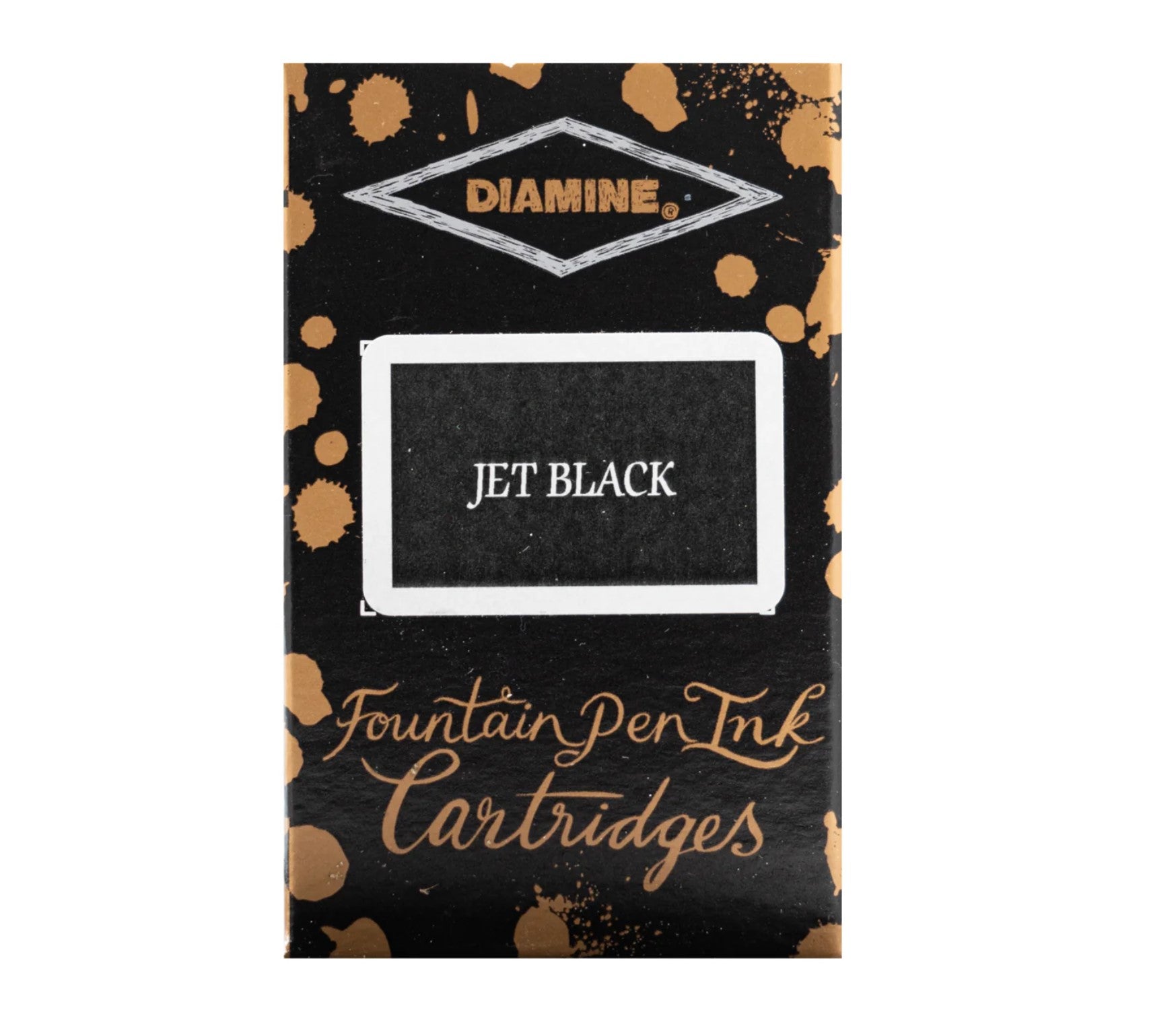 Diamine Jet Black is a standard black fountain pen ink with low shading. It dries in 40 seconds with a medium nib over Rhodia and has an average flow rate. Diamine ink has been manufactured in England since 1864.