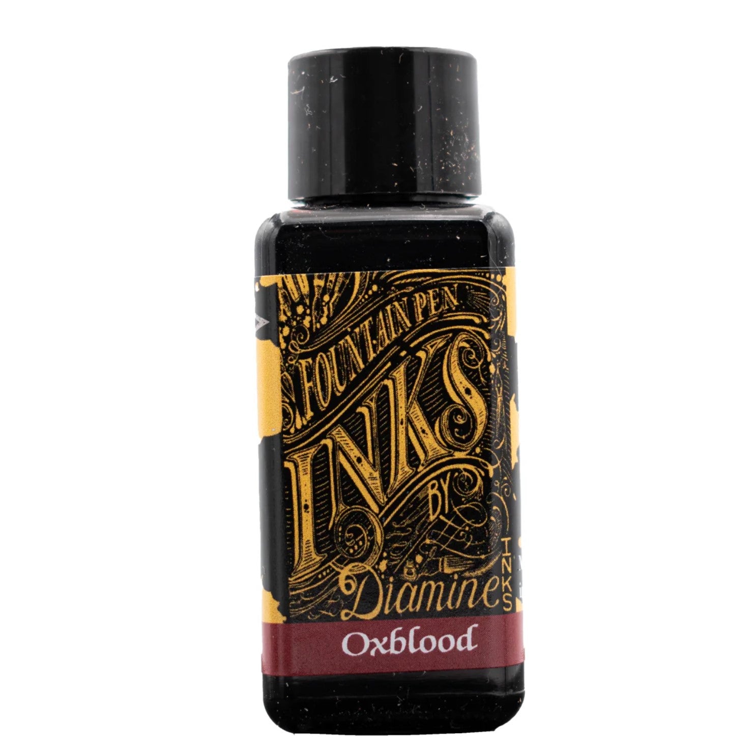 Diamine Oxblood is a deep, velvety red fountain pen ink with a slight greenish sheen. It dries in 40 seconds with a medium nib on Rhodia and has a medium flow. Diamine ink has been manufactured in England since 1864.