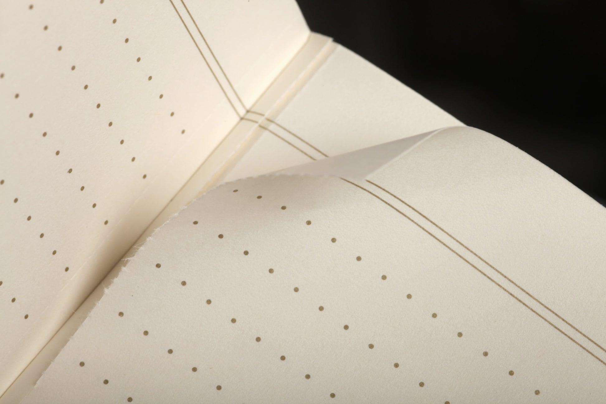 Las páginas interiores están rayadas con tinta «Faded Antique Gold» sobre papel blanquecino de Domtar. También están perforadas para facilitar su extracción. Las grapas también son doradas. ¡Claro!