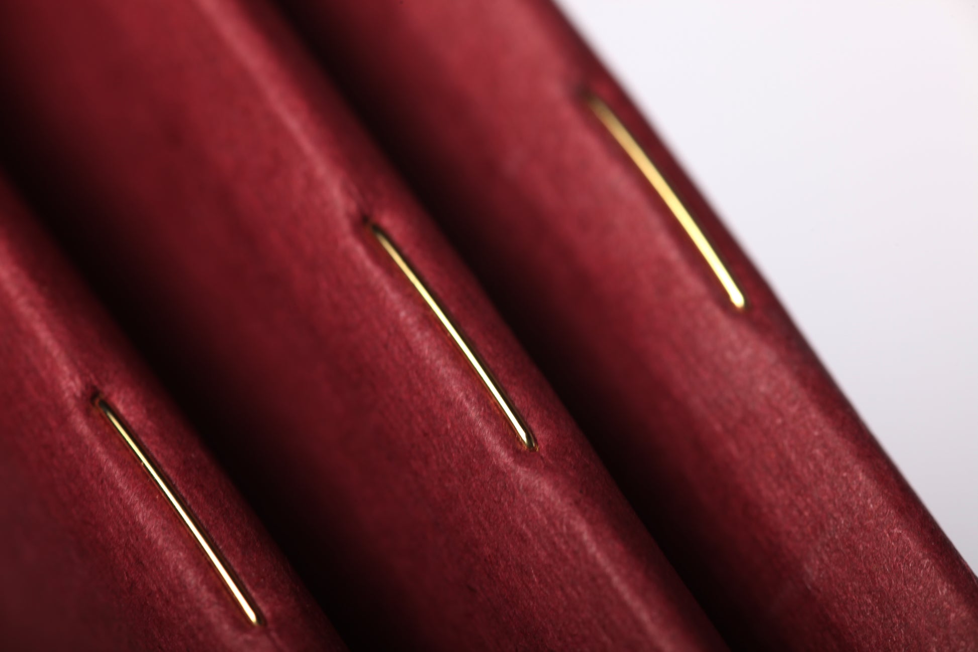 Para las tapas, se eligió un papel "Royaltone" de 100 lb de la compañía French Paper Company. Se llama "Monarch Red", pero se asemeja más al color de un buen vino. ¿Quizás un Willamette Pinot Noir 2012?