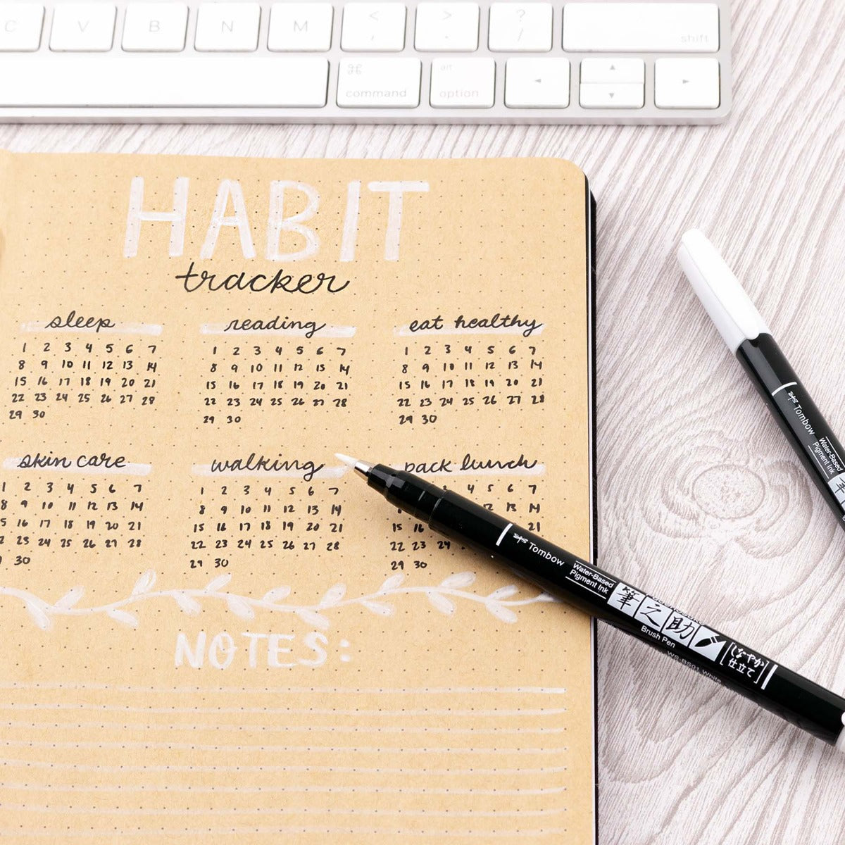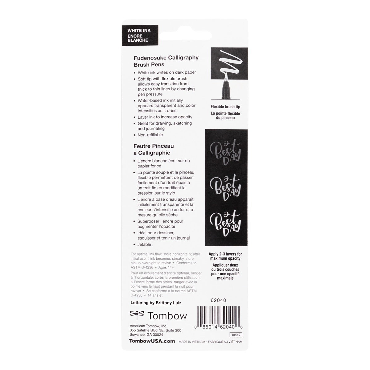 The first Fudenosuke Brush Pen that writes on dark paper! Soft, flexible brush tip creates thick and thin lines by changing pen pressure. Water-based pigment ink initially appears transparent and color intensifies as it dries for a chalky look. For optimal opacity on dark paper, apply 2-3 layers to intensify saturation. The water-resistant ink won't bleed through most papers. Great for beginner brush calligraphy, hand lettering, and illustration. Non-refillable. Store horizontally. Contains 2 soft tip Fudenosuke Brush Pens.