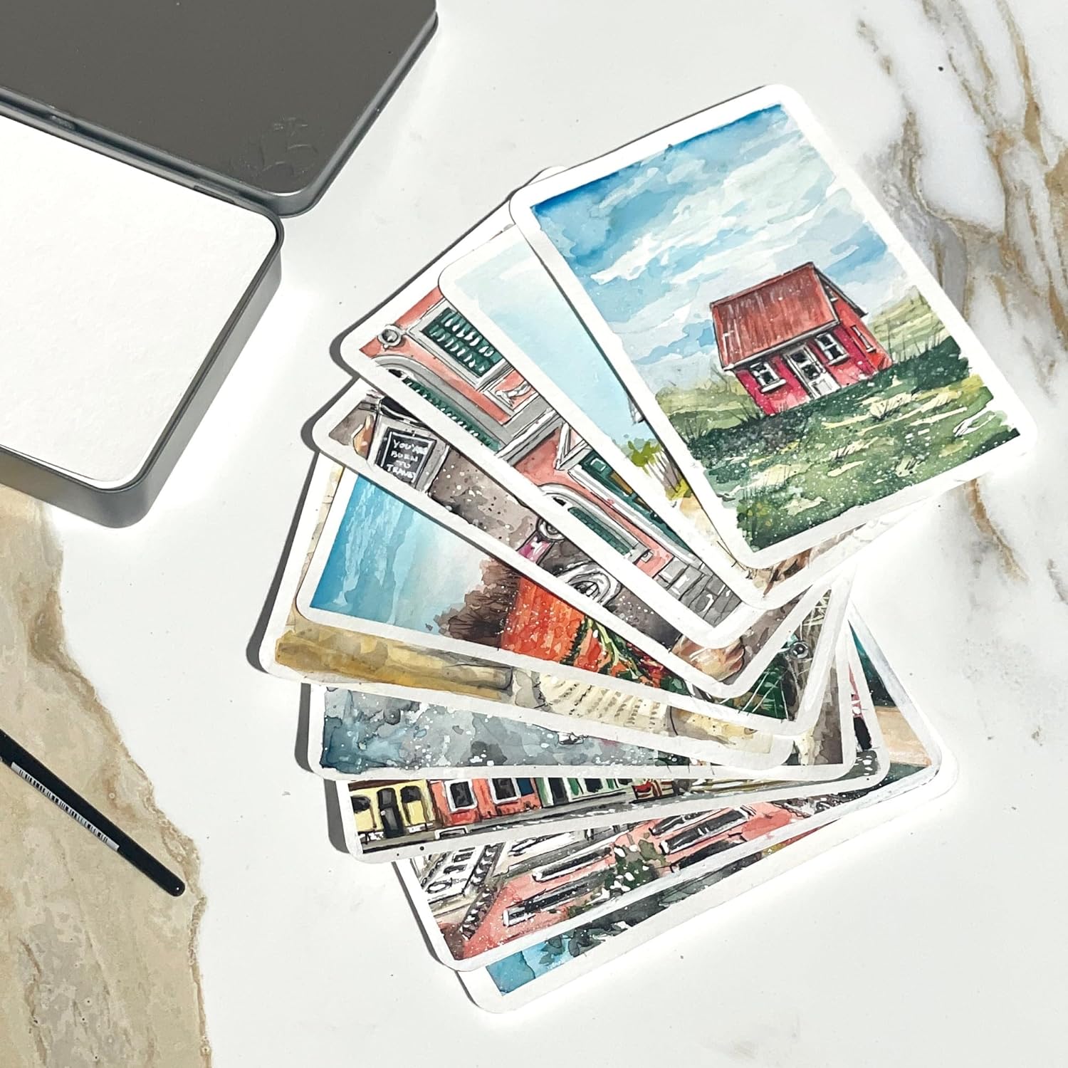 Postcards with rounded edges have a printed address field on the back, ideal for watercolorists, plein air painters, and urban sketchers on the go.