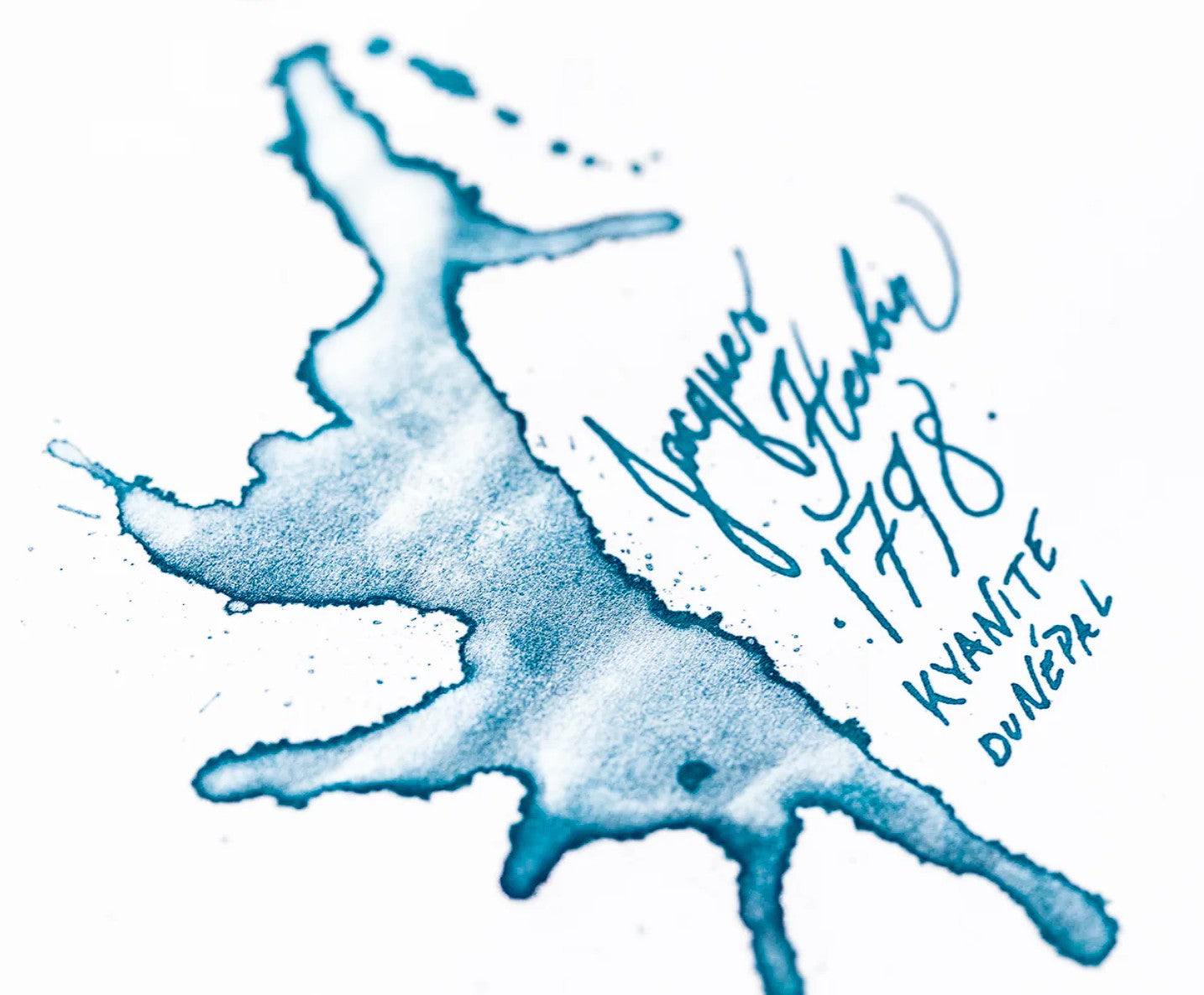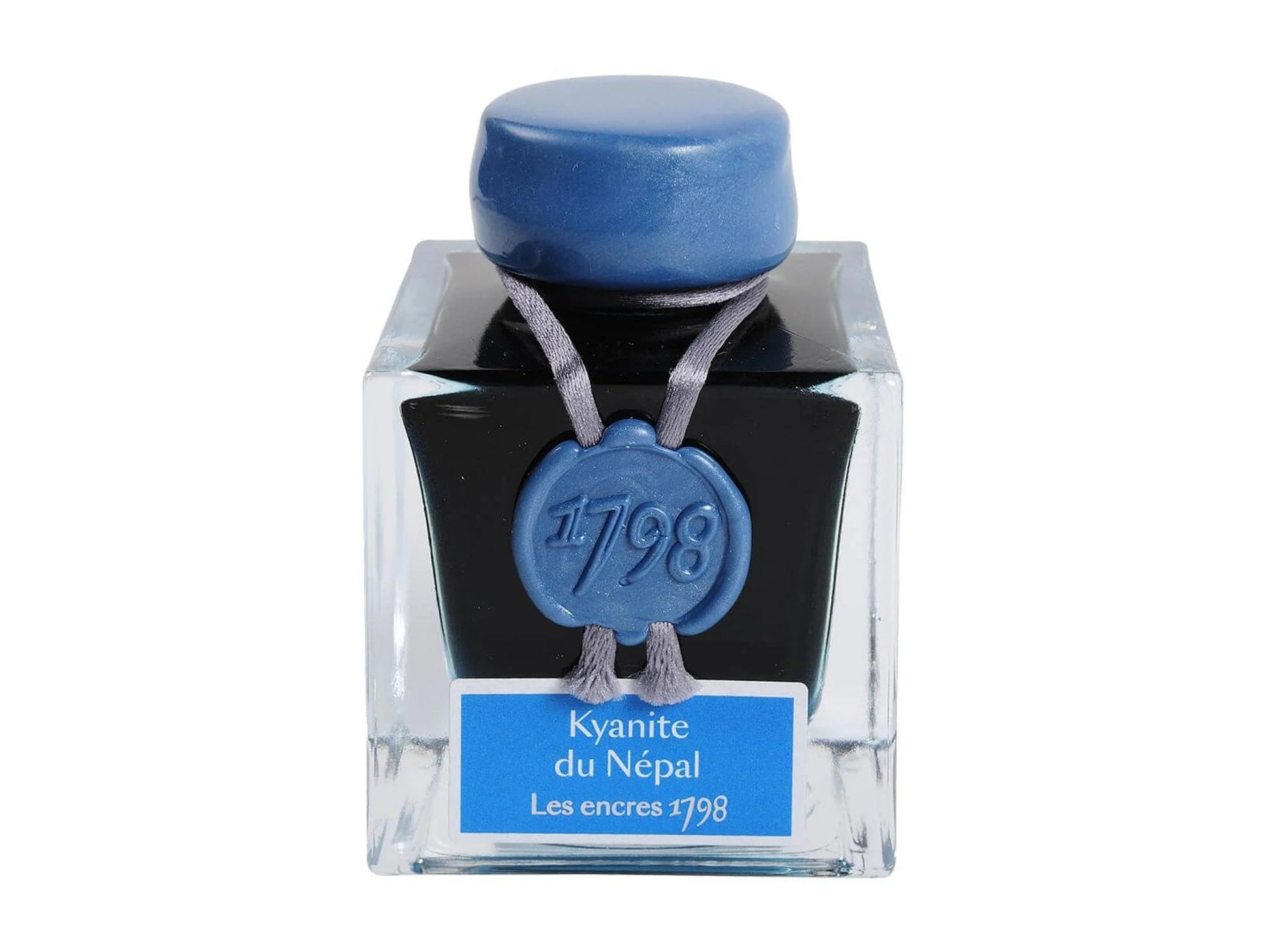 The Jacques Herbin 1798 Kyanite du Népal fountain pen ink is a brilliant blue tending toward turquoise. It is magnified by a cloud of silver glitter for powerful and elegant writing. Each cap is hand-dipped in sealing wax, stamped with the "1798" seal on the front, and individually presented in a collector's edition box.