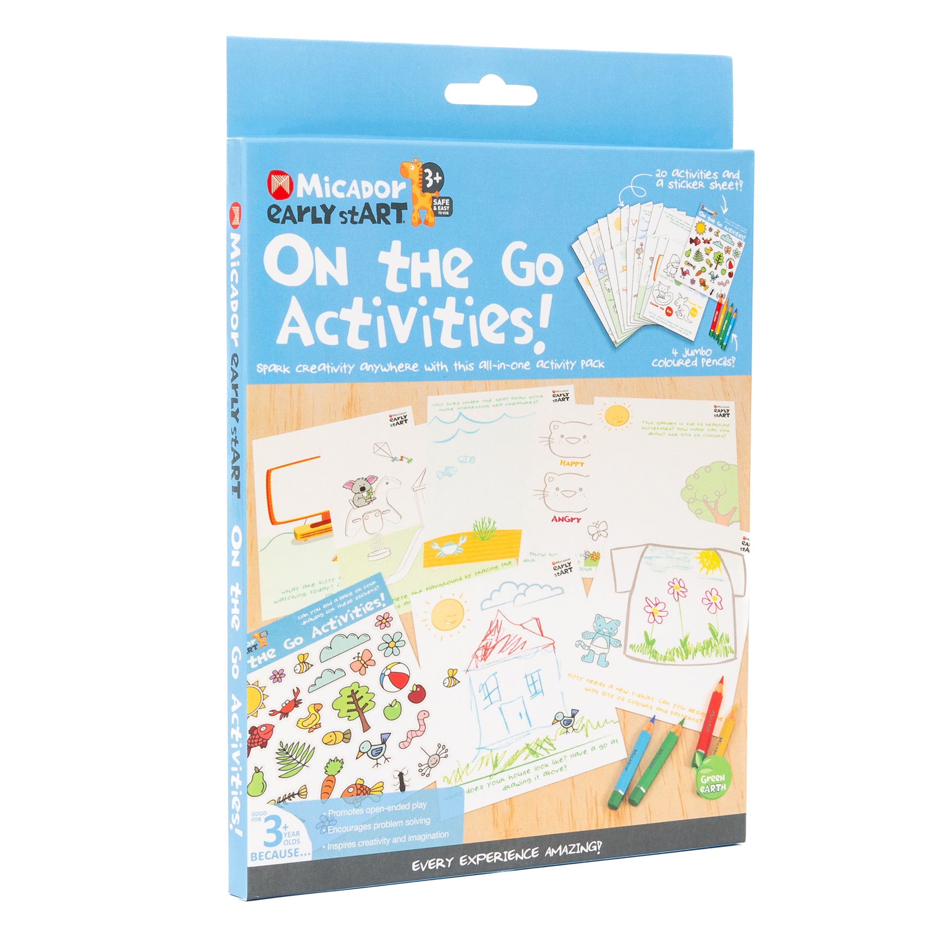 These On the Go Activity Packs promote imagination and creativity. Each pack includes 20 fun drawing activities, one sticker sheet for additional fun and four half-size colored pencils. Made from FSC-certified materials. Recommended for ages 3 and up.