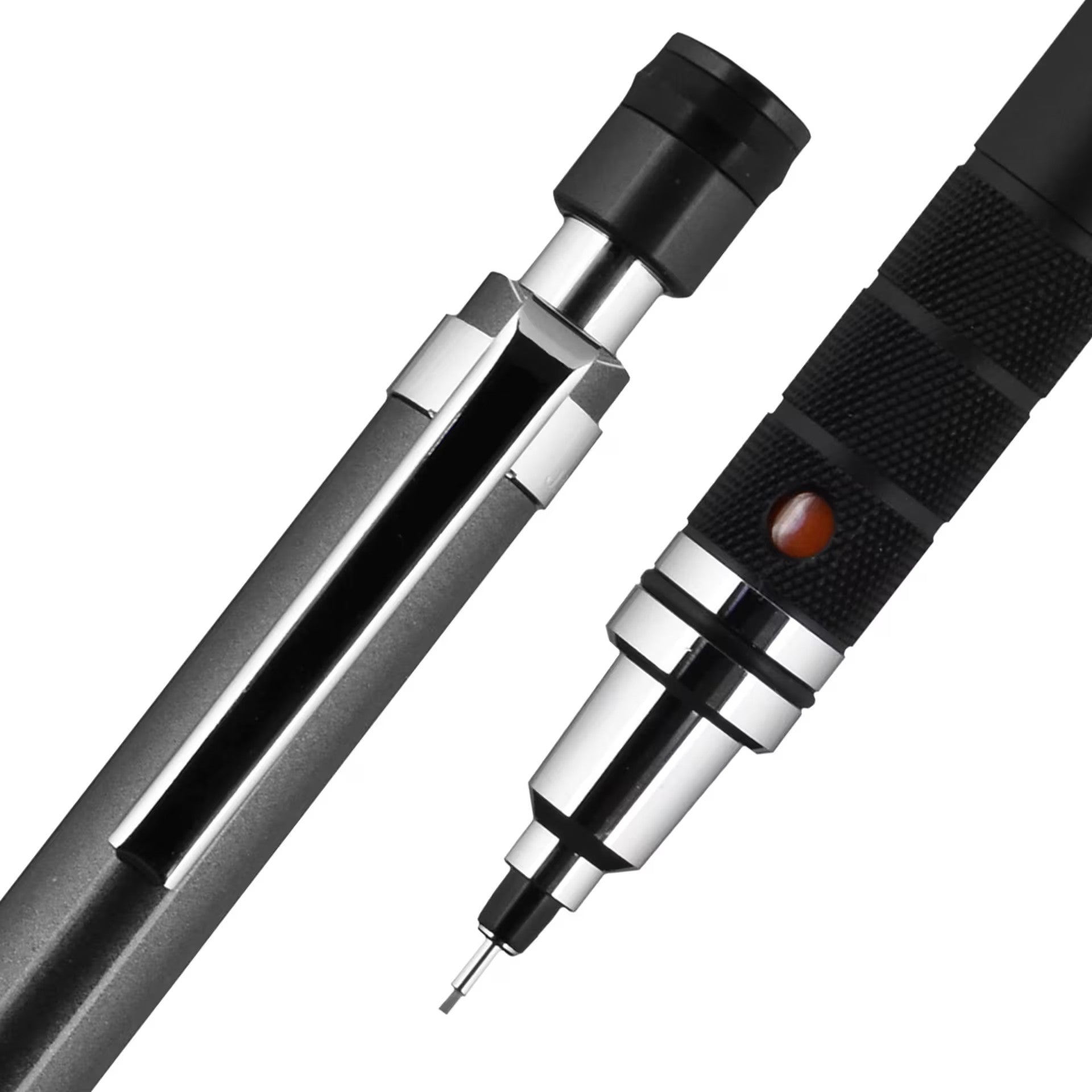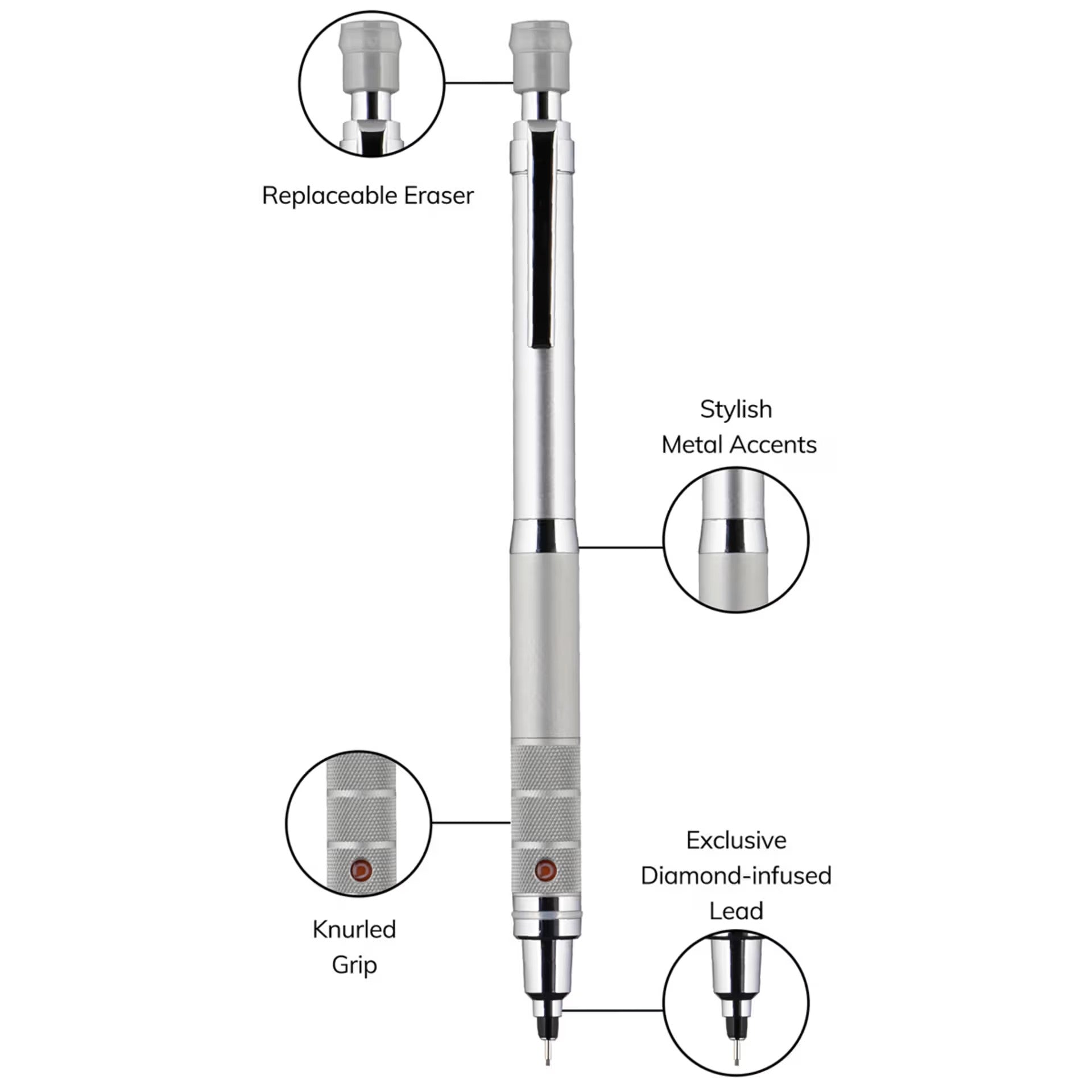 El agarre metálico moleteado de este lápiz le proporciona un peso cómodo y facilita una sujeción segura. Incluye 60 minas y cinco gomas de borrar de repuesto.