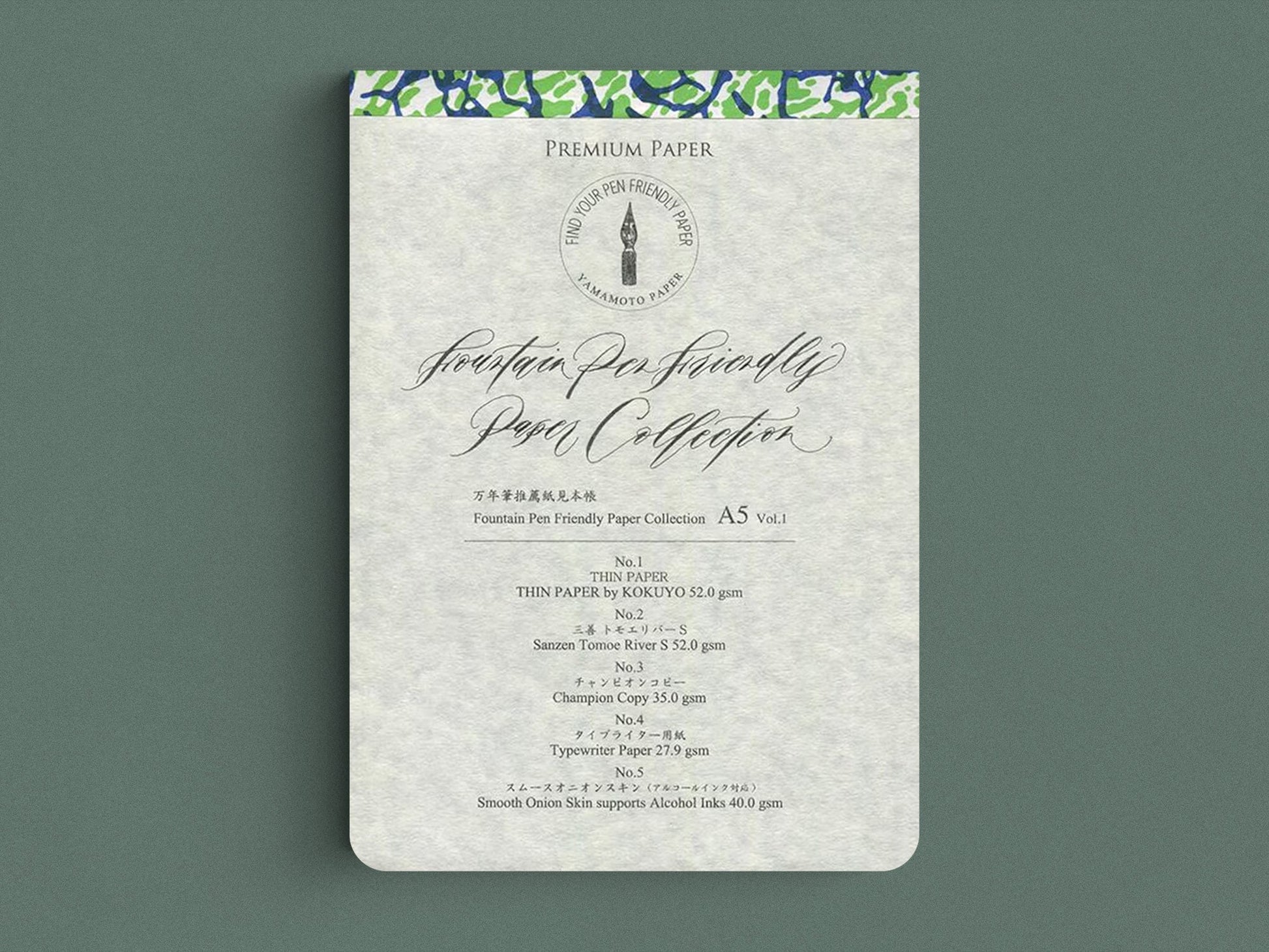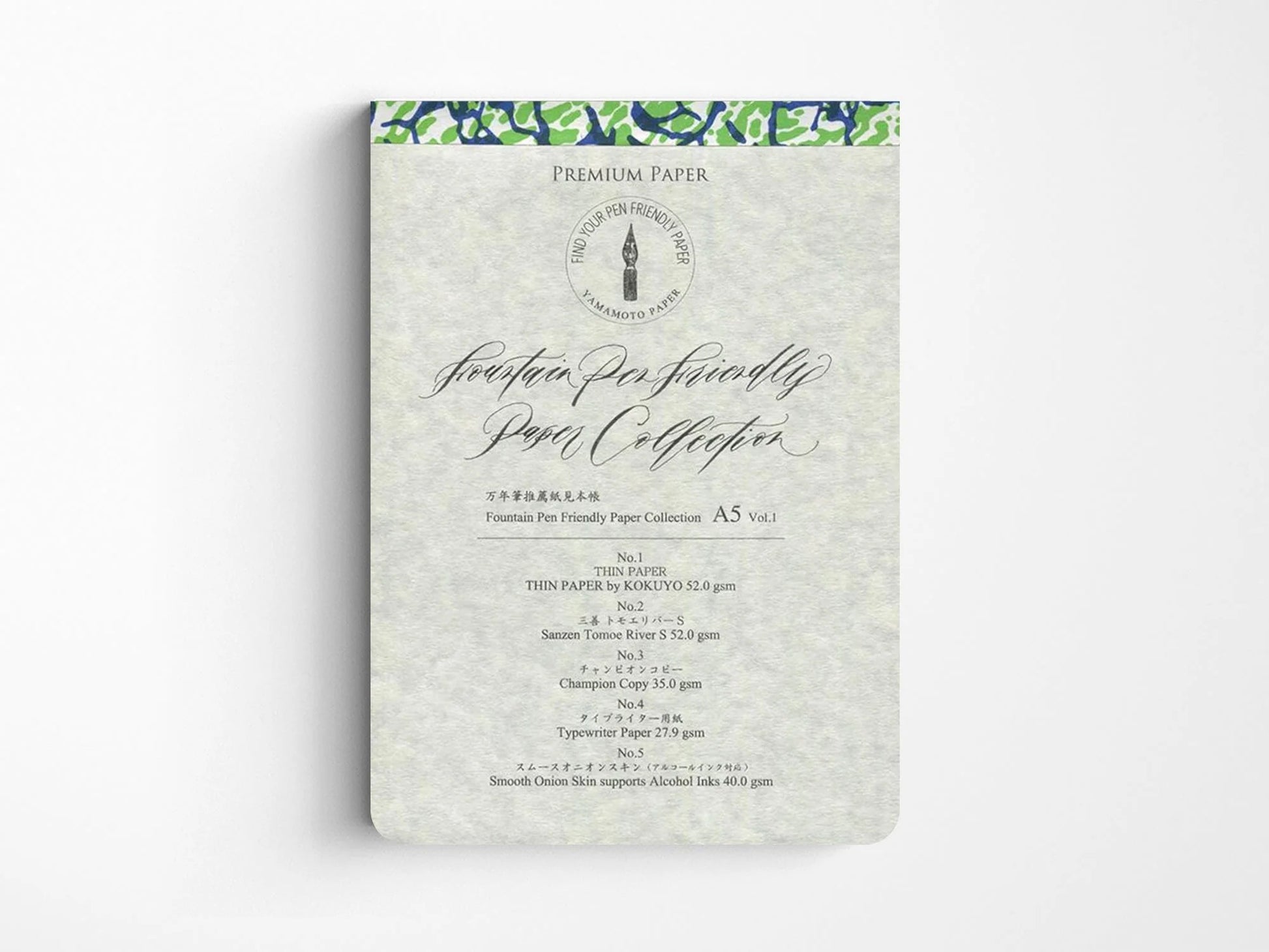 Yamamoto 's latest fountain pen-friendly paper pads are A5-sized notebooks and are available in two versions. Each pad contains five types of paper.