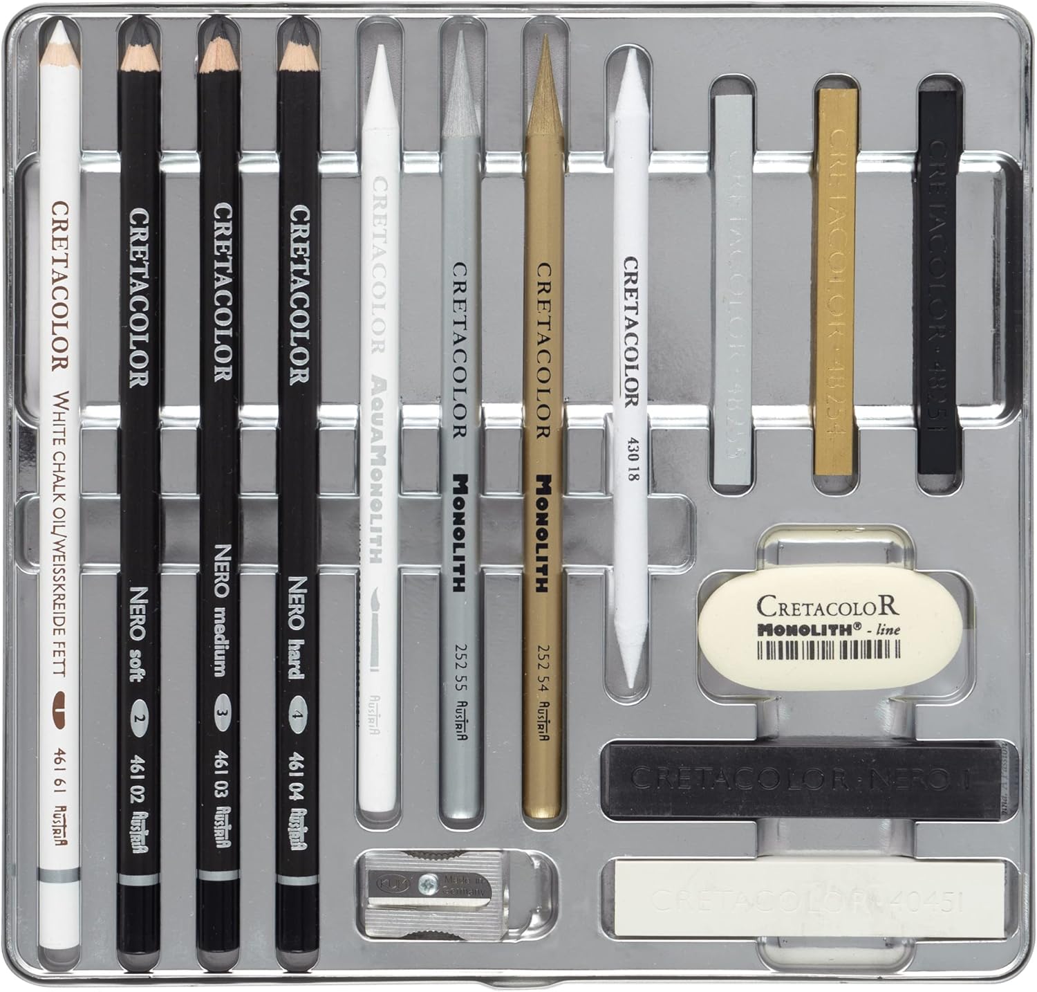 Este set de 15 piezas incluye tres barras de pastel Cretacolor en plata, oro, negro y negro intenso quemado; tres lápices Cretacolor Nero en grano blando, medio y duro; tres lápices Cretacolor Monolith en blanco, plata y oro; dos barras de arte Cretacolor grandes en grano Nero extra blando y Tiza Blanca seca; un lápiz de aceite de tiza blanca Cretacolor; un difumino; una goma de borrar; y un sacapuntas.