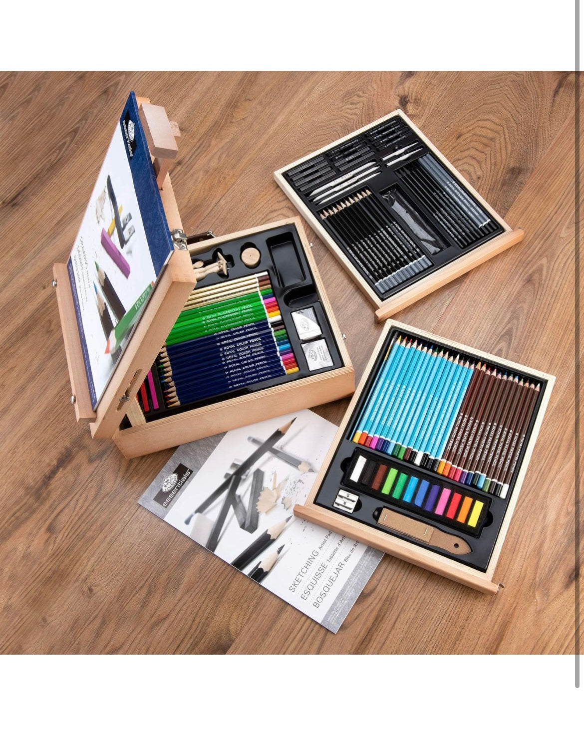 Este juego de caja de bocetos de caballete de 122 piezas presenta productos utilizados por artistas profesionales y novatos.