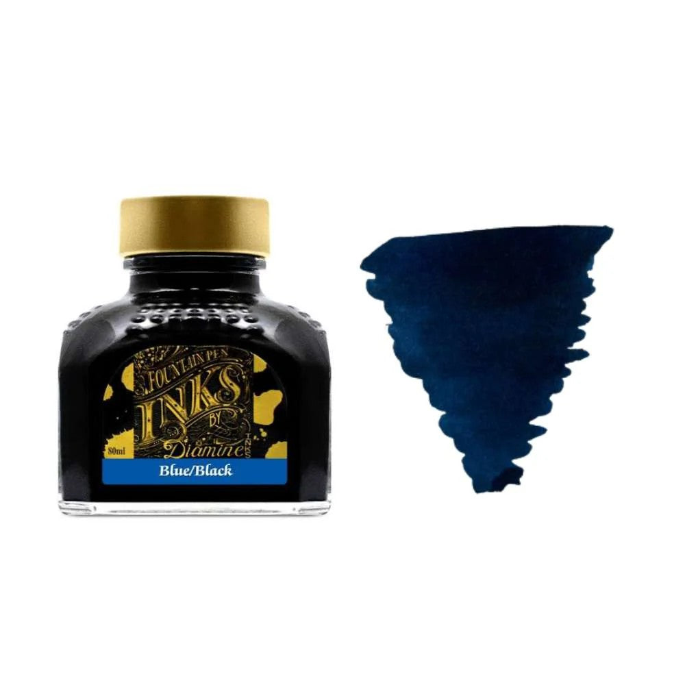Diamine Blue Black es una tinta para pluma estilográfica de color azul oscuro medio con sombreado medio. Se seca en 40 segundos con una punta mediana sobre Rhodia y tiene un flujo medio. La tinta Diamine se fabrica en Inglaterra desde 1864.