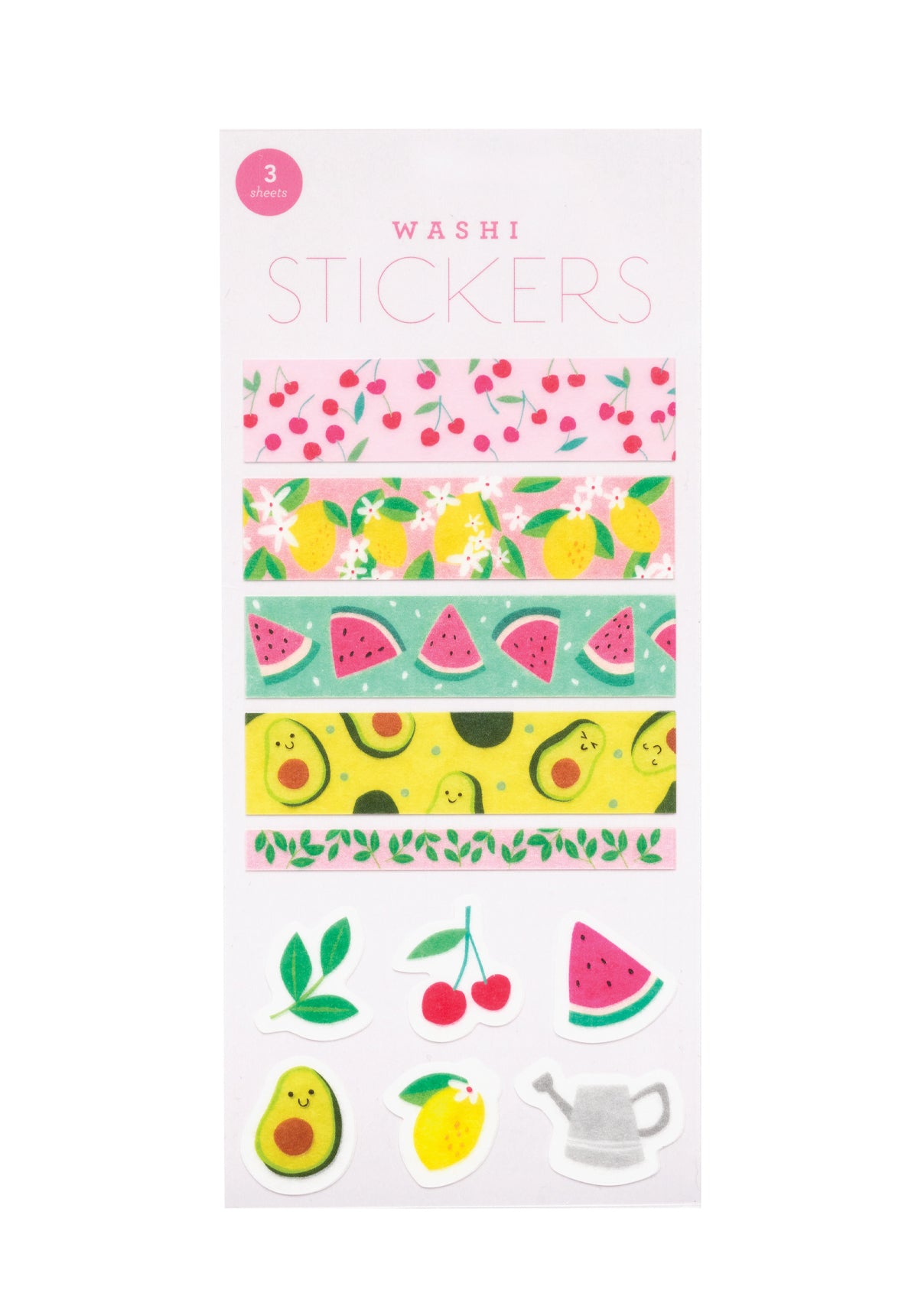 Summery and sweet. This delightful collection features pre-cut washi strips and stickers. Perfect for planners, journals, and craft projects. 3 Sheets / 2.8”x6.3”
