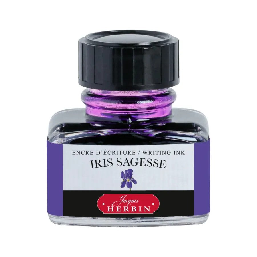 Este frasco de vidrio de 30 ml de tinta para pluma estilográfica Jacques Herbin Iris Sagesse púrpura presenta una elegante etiqueta y un reposaplumas integrado.