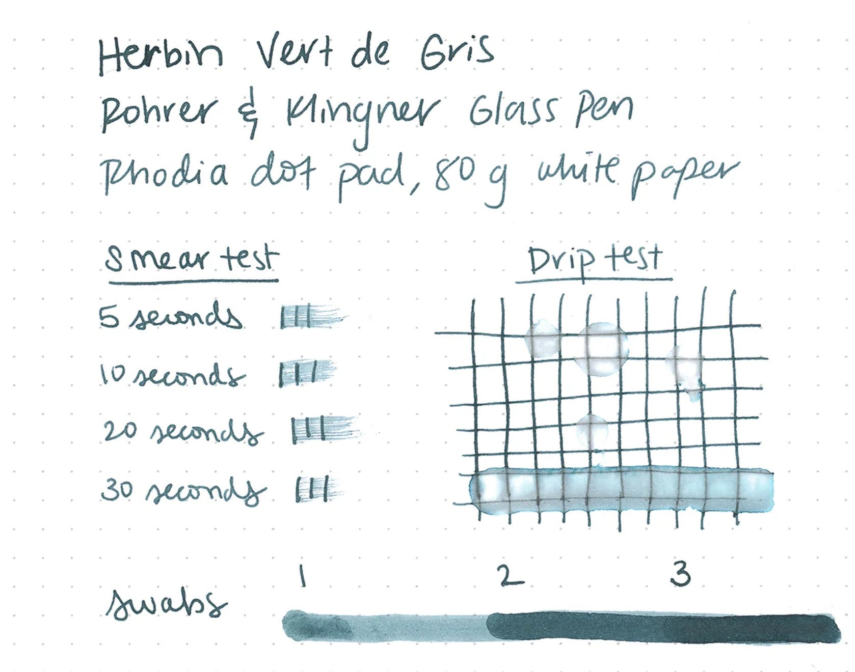 J Herbin Vert De Gris de la colección Standard es una tinta gris azulada profunda con sombreado bajo. Se seca en 20 segundos con una punta mediana sobre Rhodia y tiene un flujo medio.