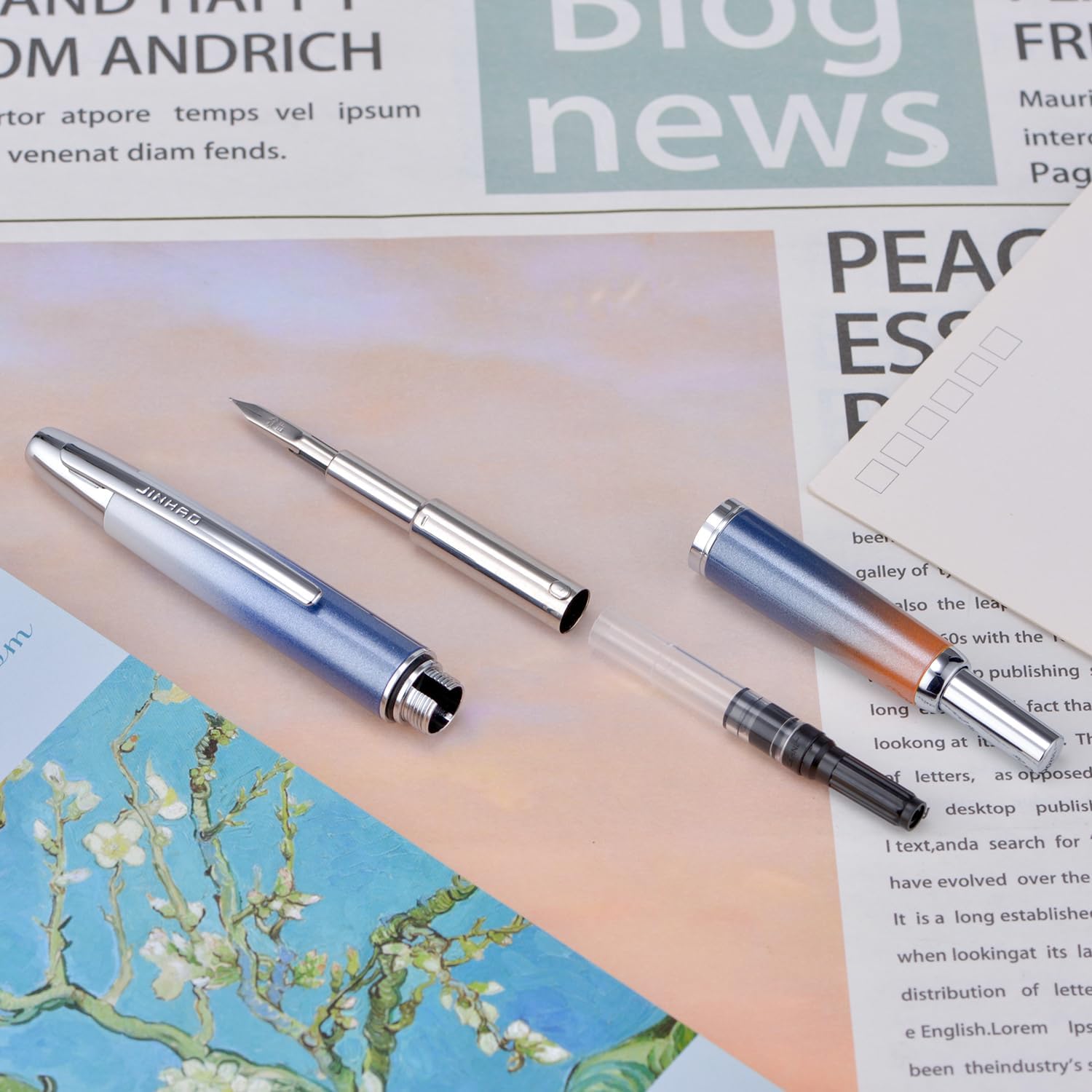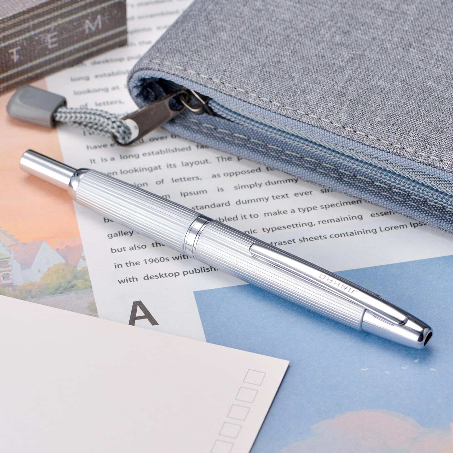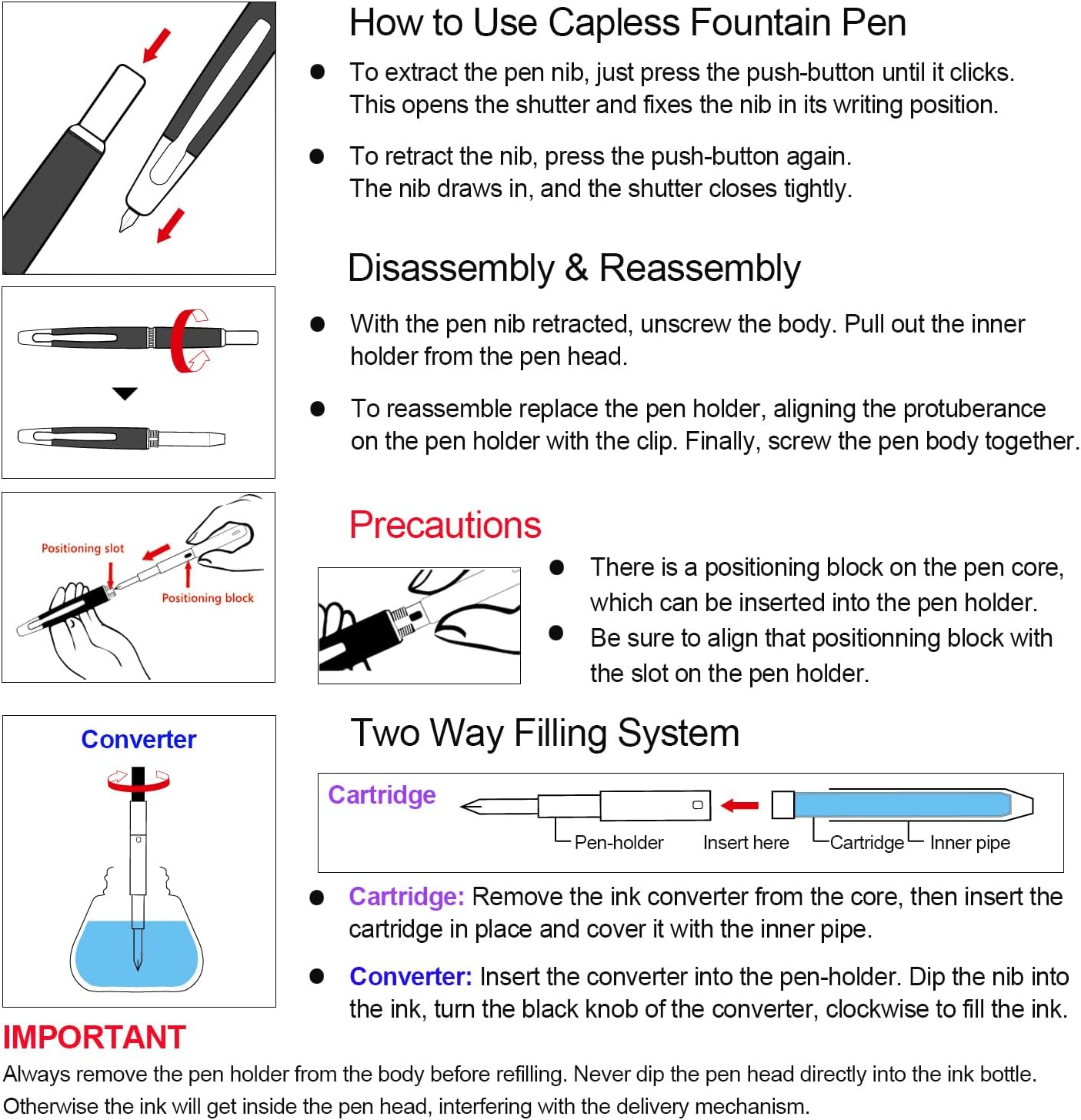 El cuerpo del bolígrafo está hecho de metal, lo que no solo resulta cómodo al tacto, sino que también le da un aspecto más texturizado. Tenga en cuenta que esta pluma estilográfica sin capuchón JINHAO 10 incluye un convertidor de tinta. Puede usar tinta embotellada sin carbón o cartuchos de tinta (NO compatible con cartuchos de tinta normales Jinhao de 2,6 mm o 3,4 mm).