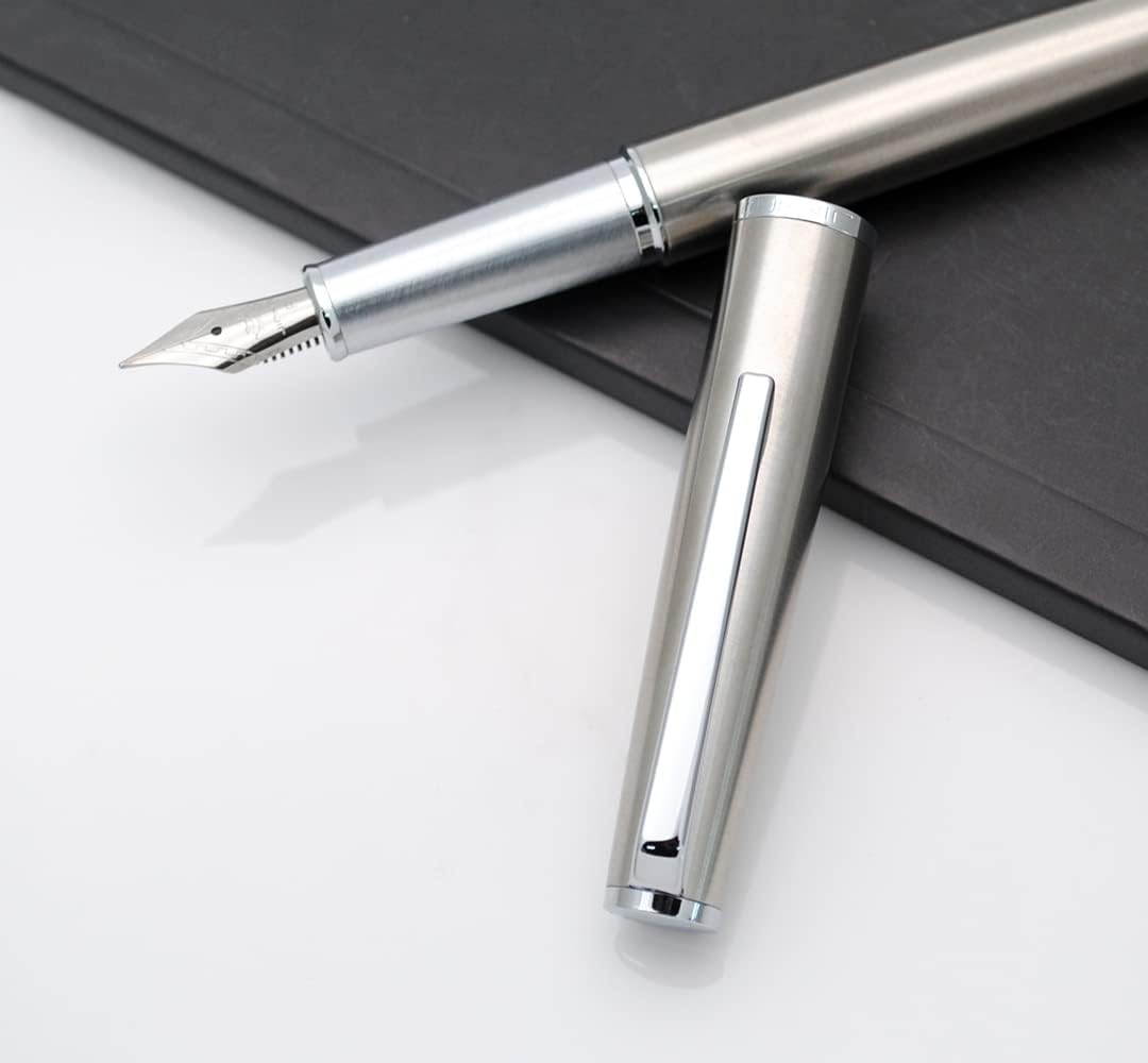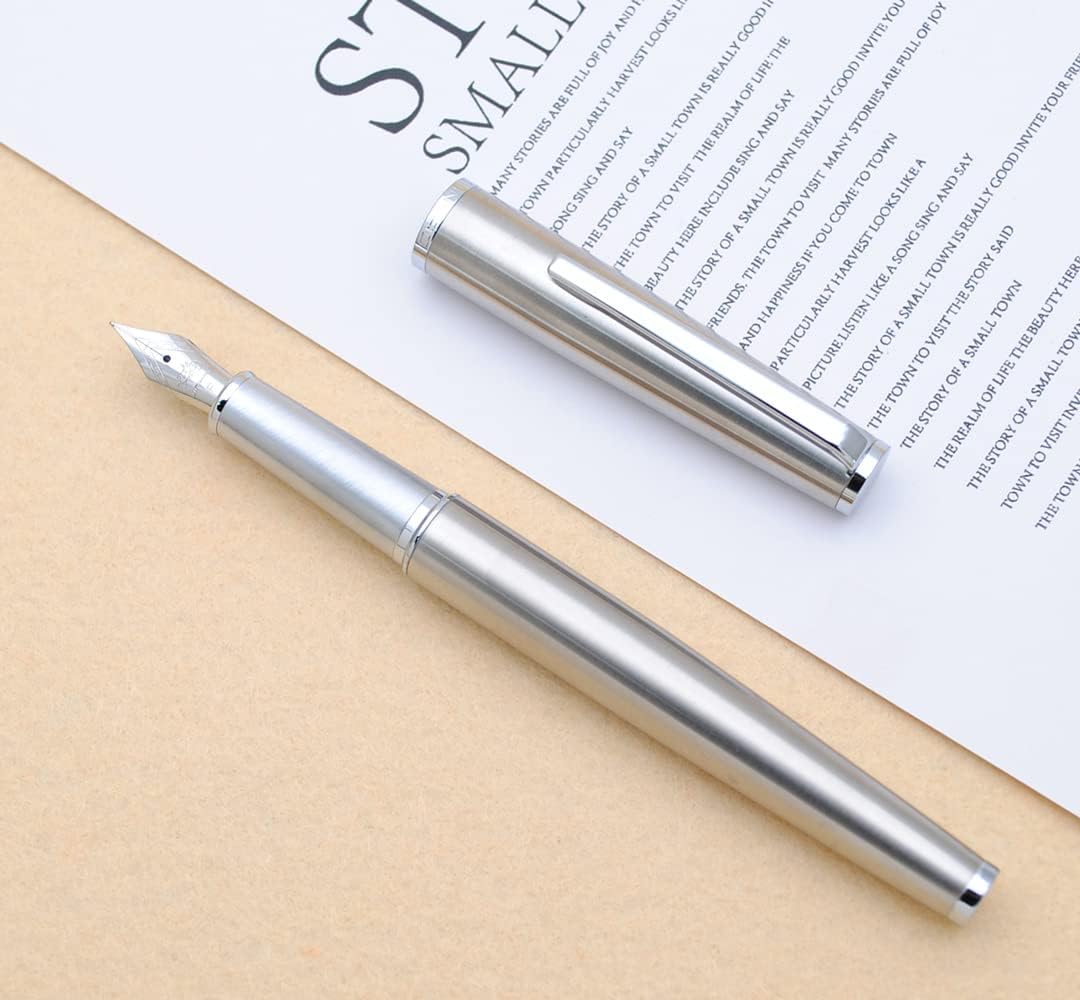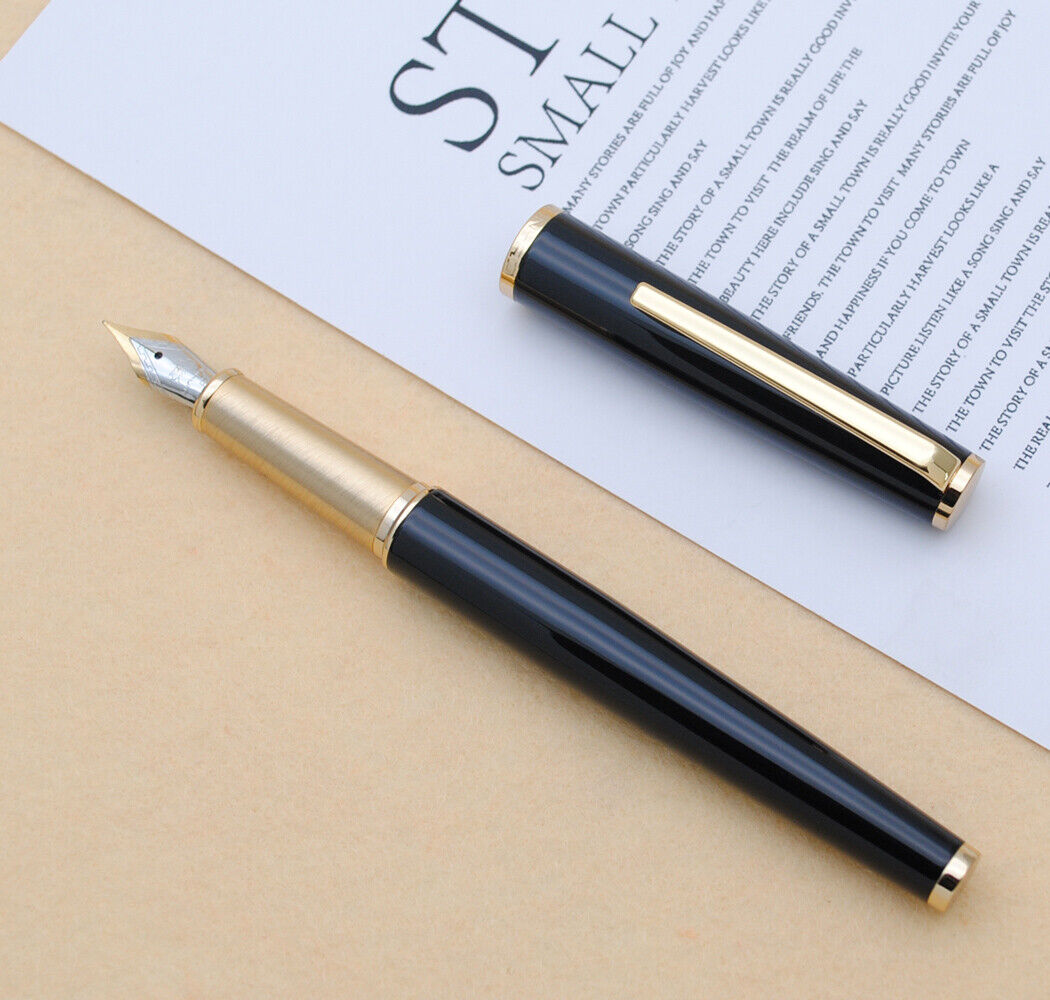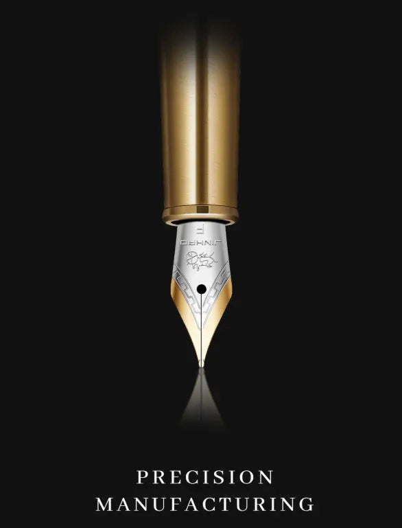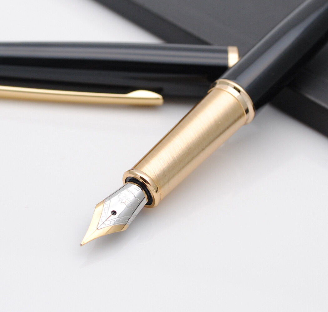 Jinhao #95 series, made of metal with gold details (except silver), 0.5mm fine point. It comes with a ink converter and a gift box.