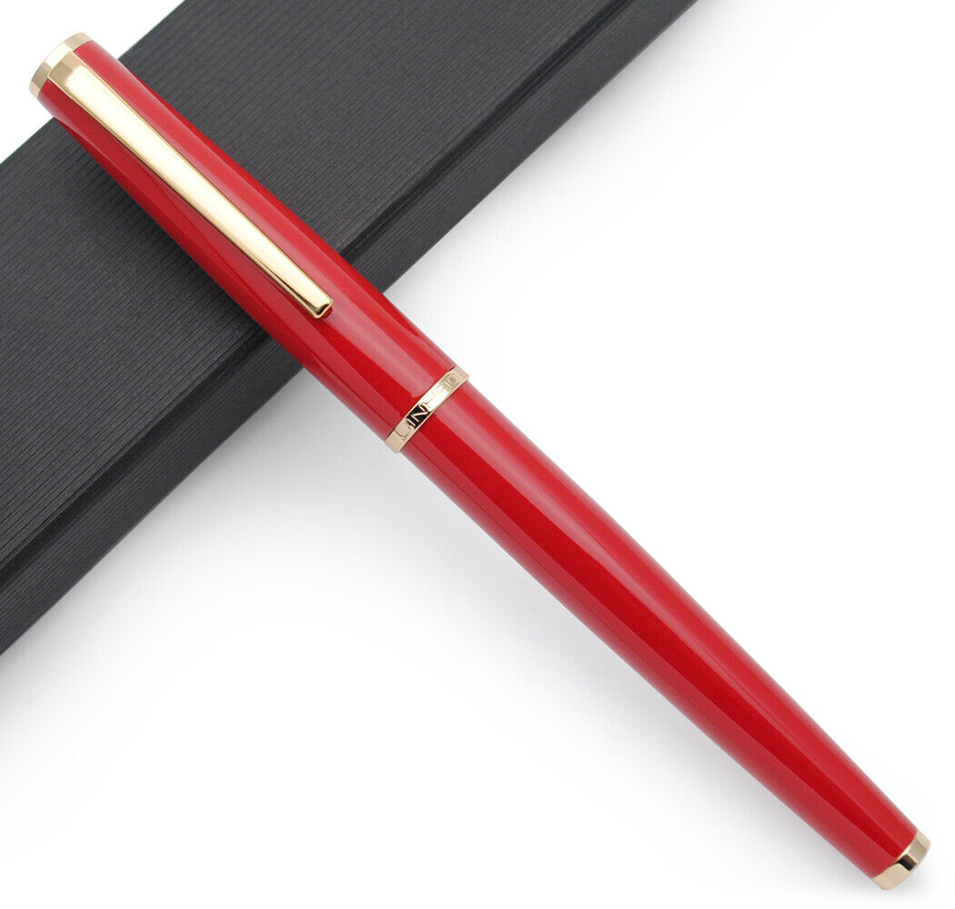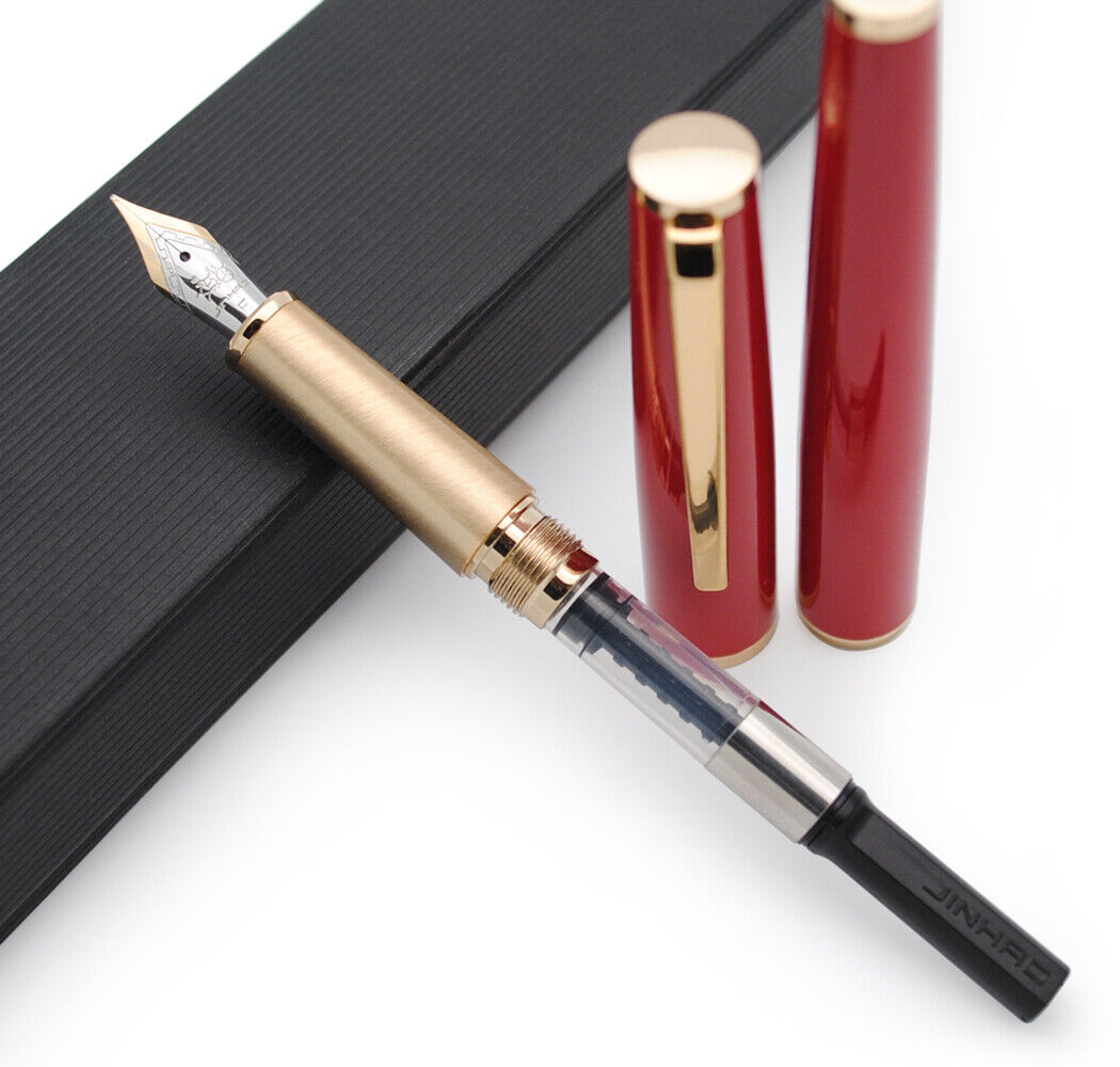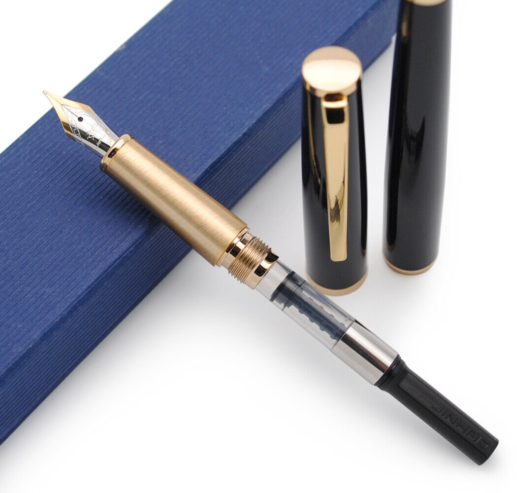 La serie Jinhao #95, hecho de metal con detalles en dorado (excepto el plateado), punta fina de 0.5mm. Trae su convertidor para la tinta y una caja de regalo.