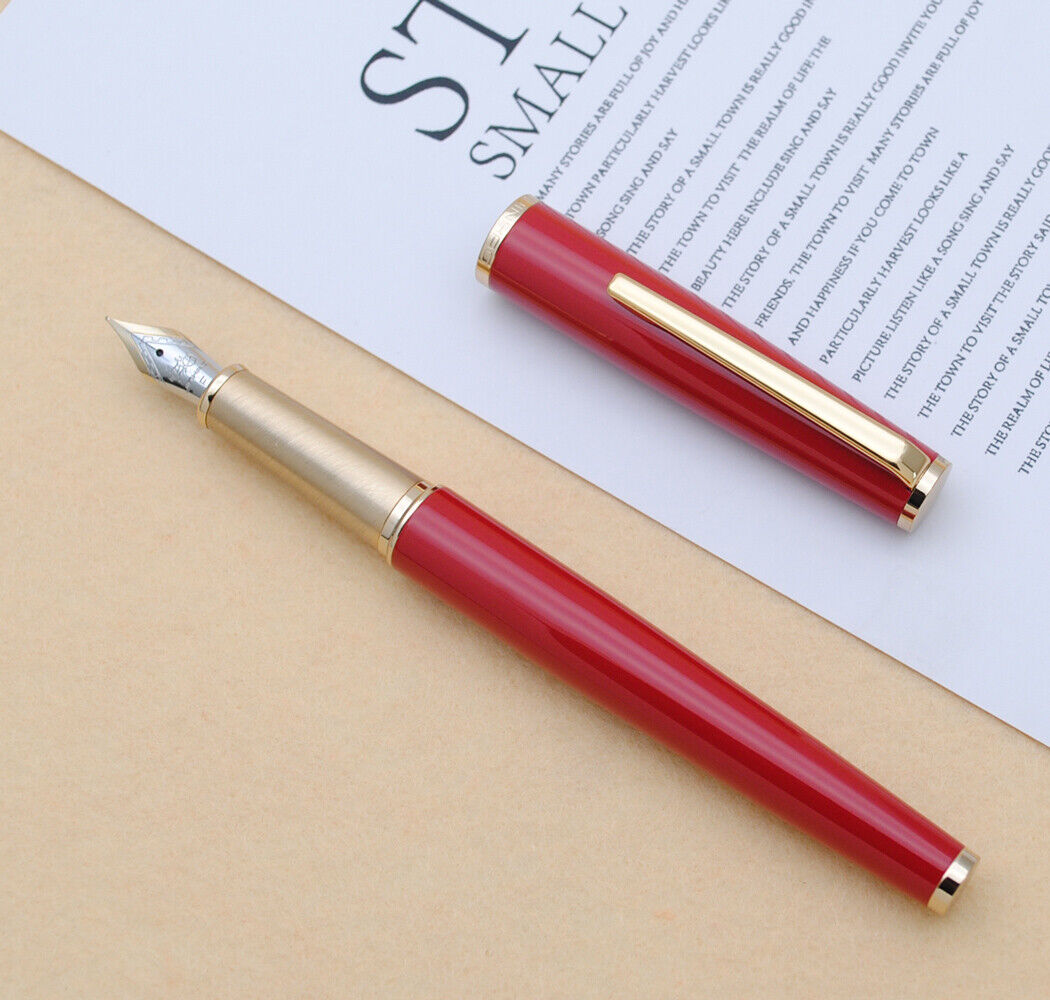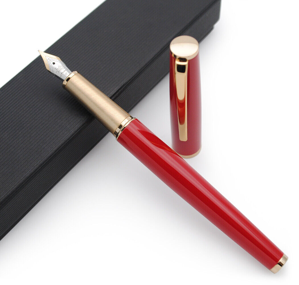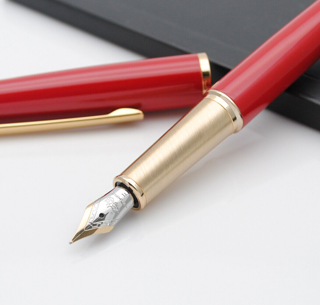 La serie Jinhao #95, hecho de metal con detalles en dorado (excepto el plateado), punta fina de 0.5mm. Trae su convertidor para la tinta y una caja de regalo.