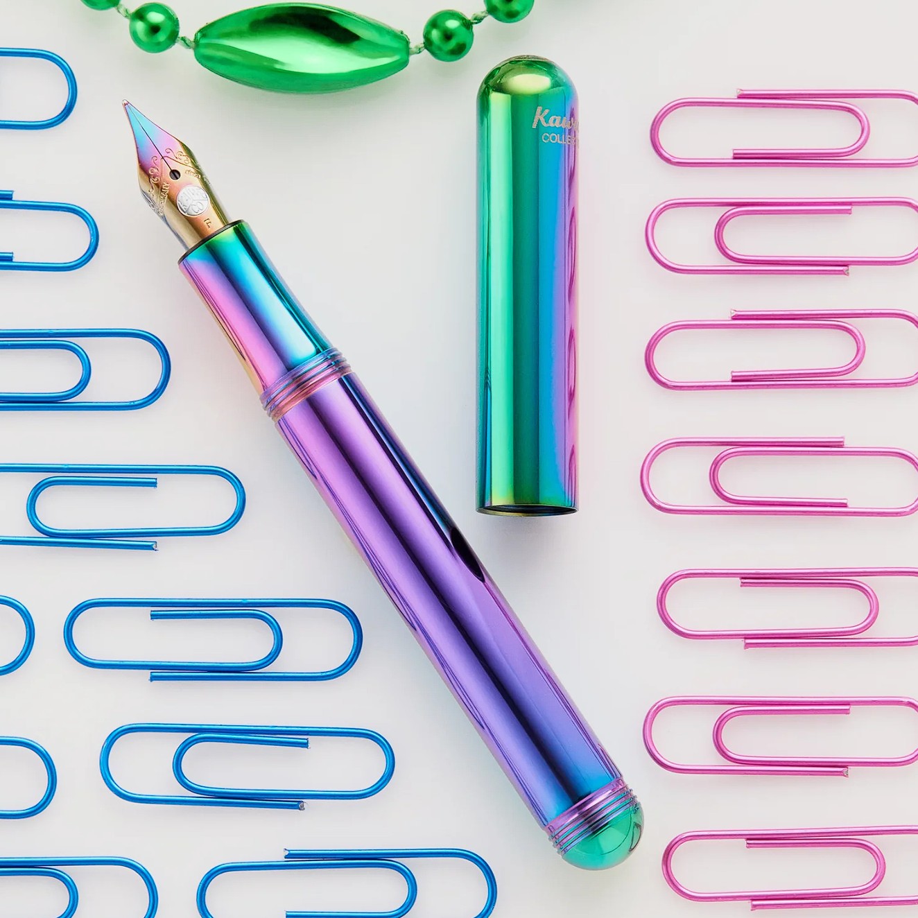 Esta exótica pluma estilográfica cuenta con un plumín tratado térmicamente con láser que resplandece con colores del arcoíris.