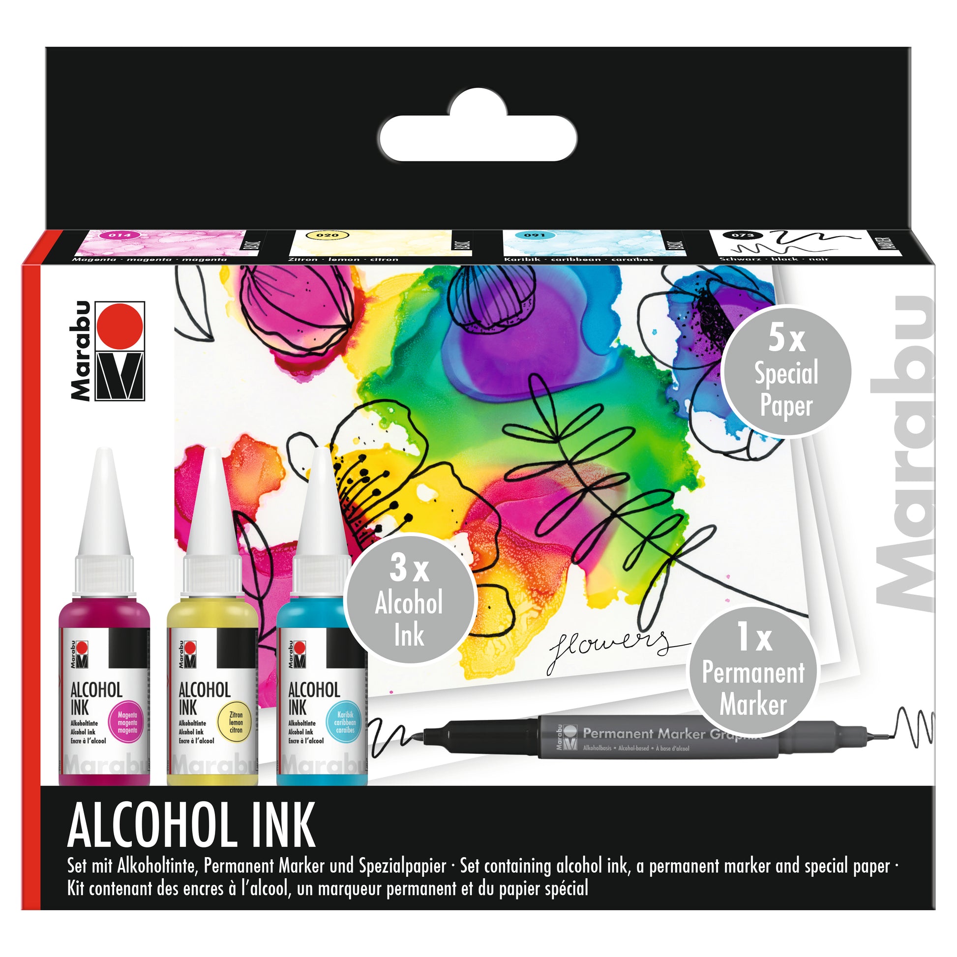 La tinta de alcohol es de secado rápido, permanente, libre de ácido y difuminable. Cada set incluye las herramientas necesarias para empezar a usar este medio. El marcador permanente a base de alcohol con punta doble (1 mm/0,5 mm) permite añadir adornos, letras o dibujos a diseños con tinta de alcohol seca. El papel mate no absorbente para tinta de alcohol es ideal para la tinta de alcohol Marabu y permite un flujo de tinta óptimo.
