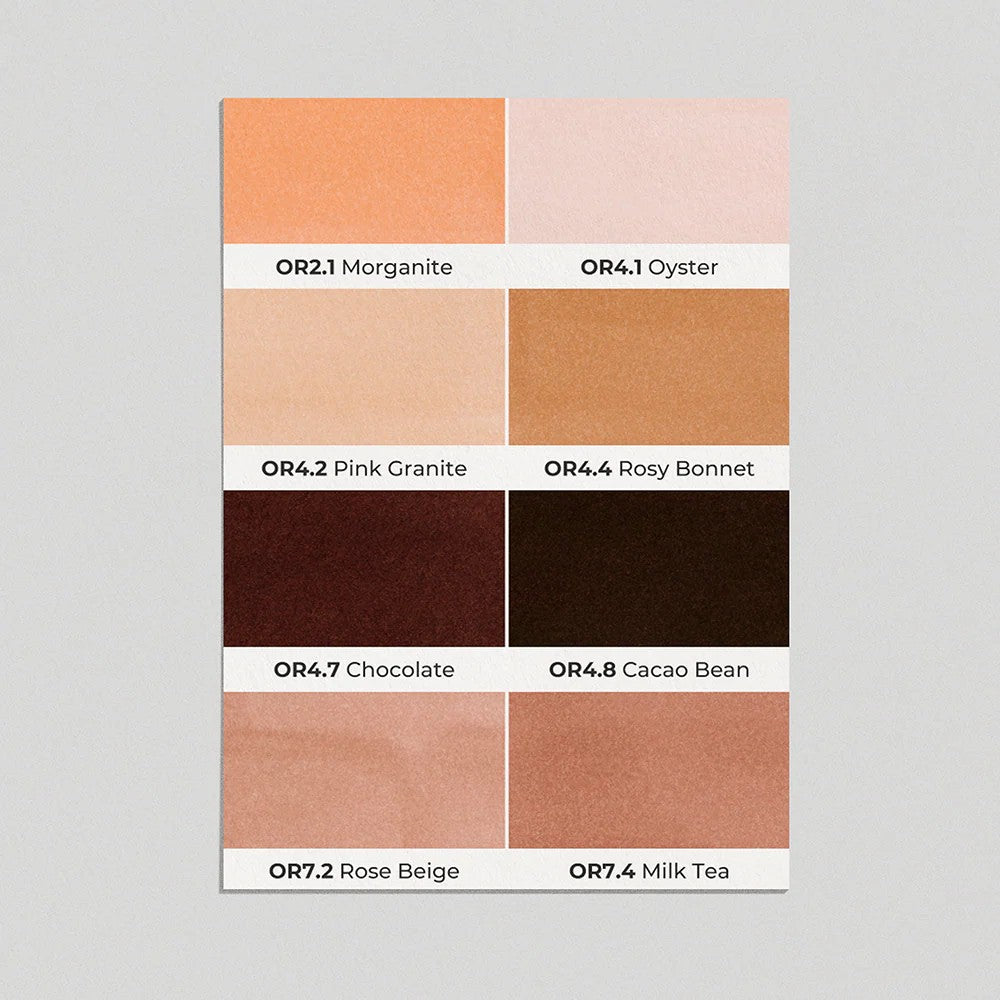 Colores del set: OR2.1 Morganita, OR4.1 Ostra, OR4.2 Granito Rosa, OR4.4 Bonnet Rosy, OR4.7 Chocolate, OR4.8 Grano de Cacao, OR7.2 Beige Rosa, OR7.4 Té con Leche.