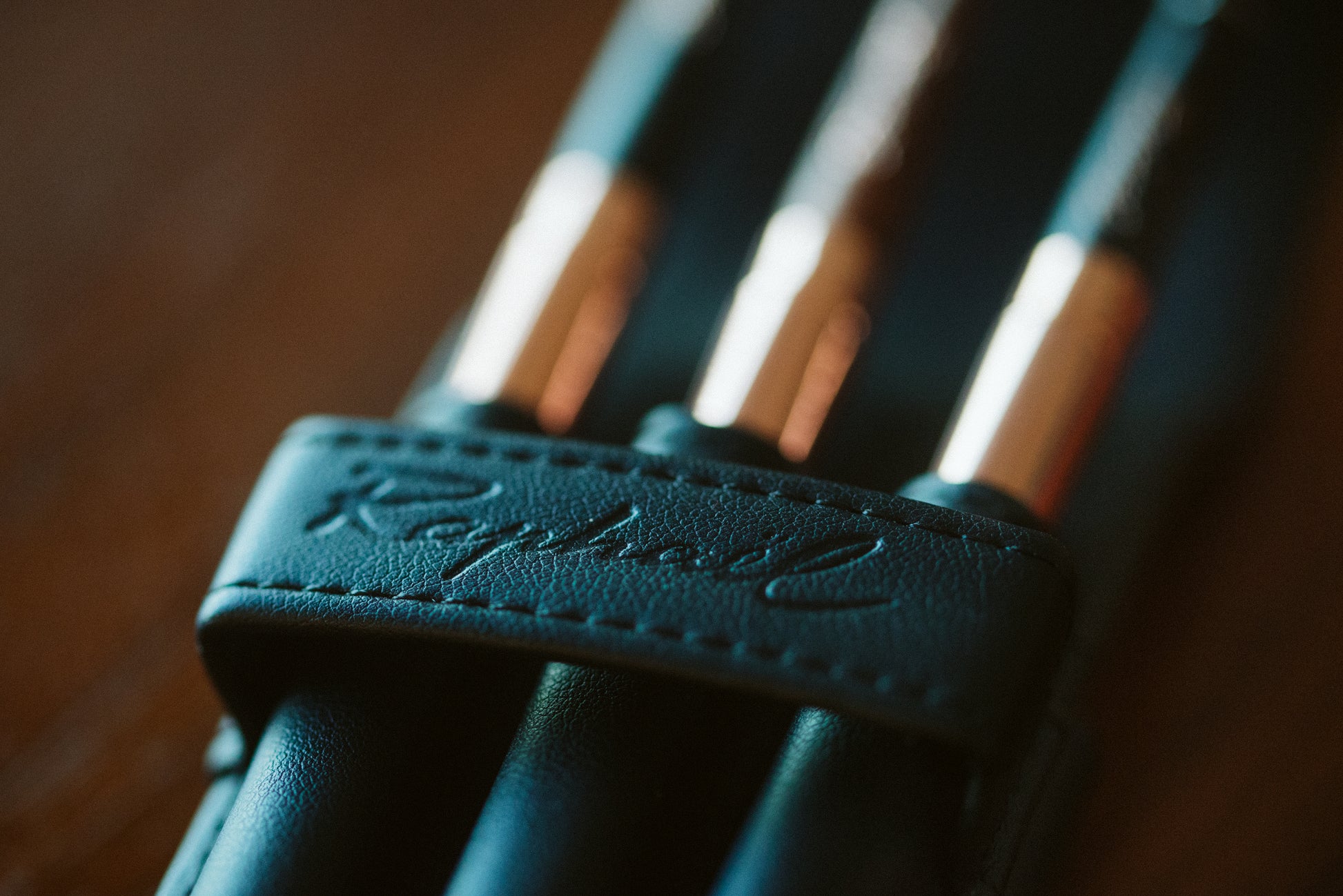 Esta elegante funda negra de símil piel incluye tres pinceles de viaje: