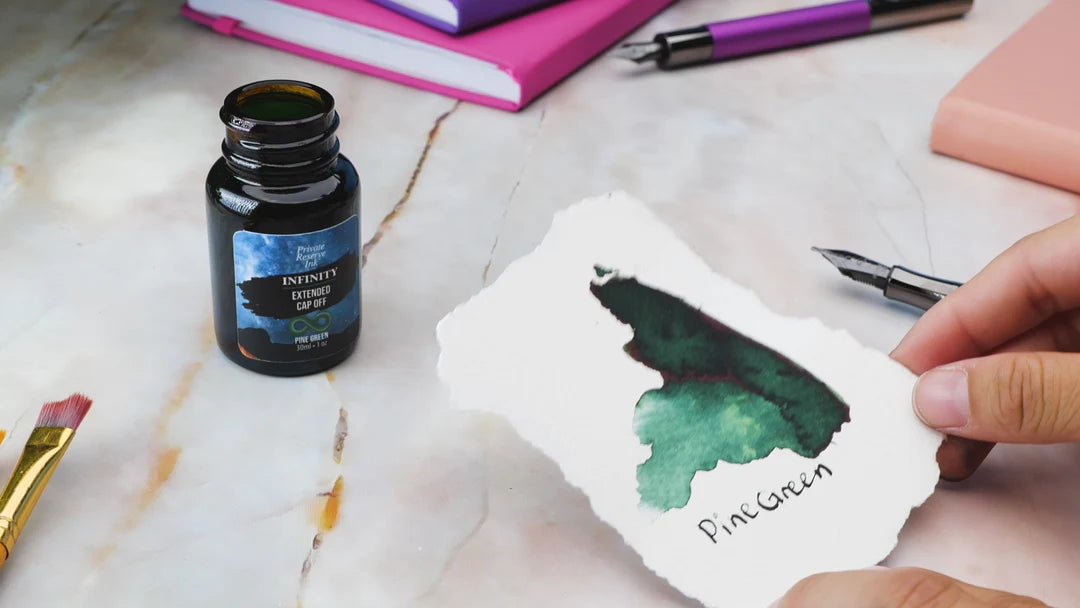 La tinta Private Reserve Infinity Pine Green ofrece un vibrante tono verde que realza la escritura y las ilustraciones. Diseñada para una saturación de color excepcional y un rendimiento confiable, resiste la decoloración y el plumaje.